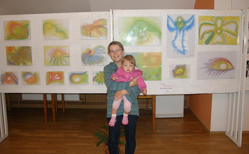 Martina Pesničáková s vnučkou před svými obrázky -
